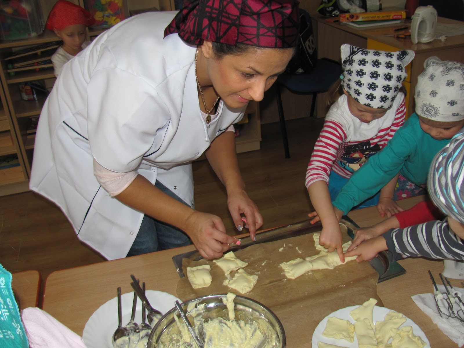 Dnia 27.11.2015 r. przyrządzaliśmy wspaniałe greckie pierożki - Tiropitakia. W warsztatach uczestniczyli Rodzice Oskara - p. Arletta i p. Robert, którzy wcielili się w szefów naszej przedszkolnej kuchni. Dzieci podzielone na zespoły, rozgniatały sery, wbijały jaja, miksowały wszystkie składniki na gładką masę. Tym samym powstało nam nadzienie do greckiego przysmaku. Dzieci nadziewały ciasto fransuskie, uprzednio posmarowane roztopionym masłem i składały w niesamowite i niepowtarzalne kształty - pierożki.