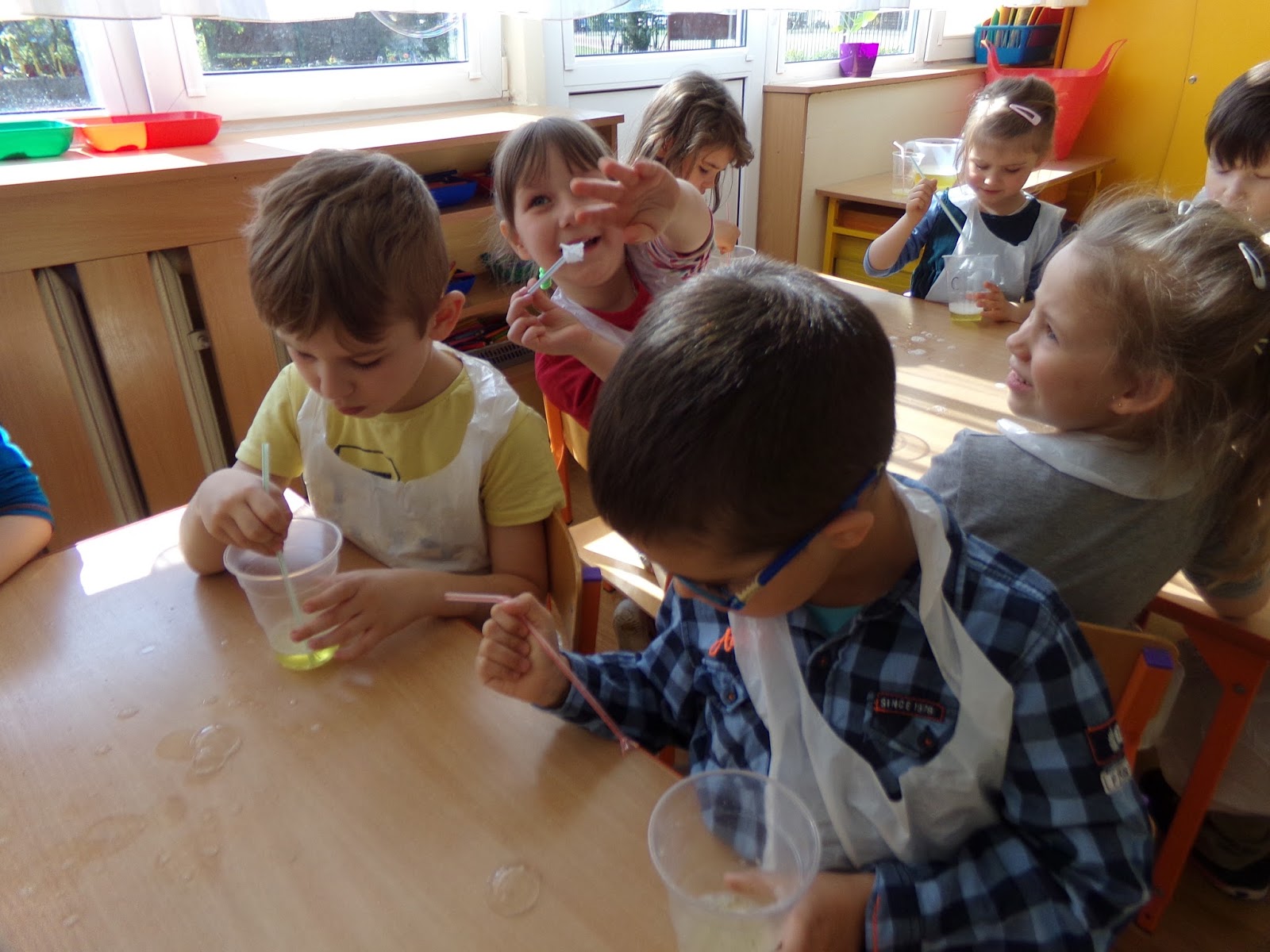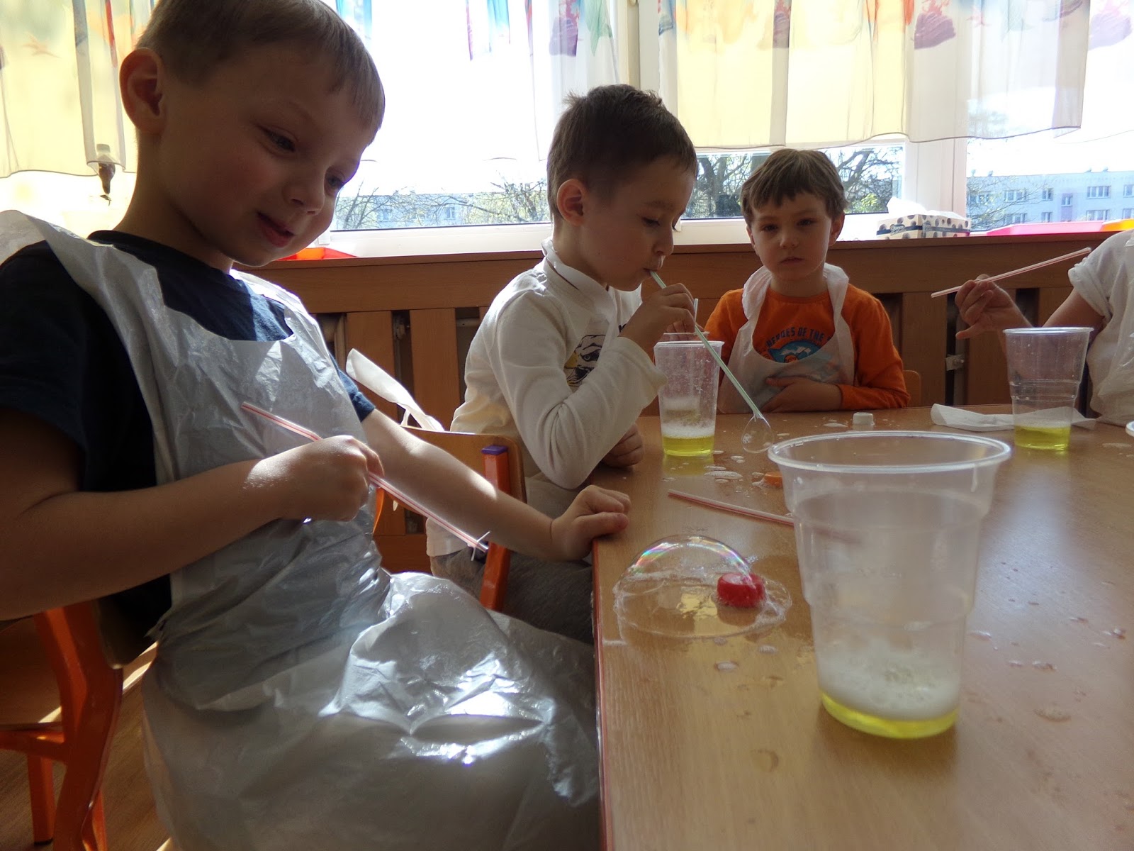 Dnia 28.04. 2016 r. odbyło się kolejne spotkanie KMO "Poszukiwacze Przygód". Nasze rozważania krążą wokół powietrza, maszyn latających, ptaków, dlatego postanowiłam pokazać dzieciom proste, a zarazem zabawne działanie ukazujące zjawiska przyrodnicze z lataniem. Dzieci tworzyły bańki latające oraz "leżące" na stole. Próbowały umieścić korek w bańce lub zrobić bańkę w bańce. Starały się wydmuchać bańkę największą oraz takie malutkie w dużej ilości. Uczyły się jak należy dmuchać przez słomkę, by uzyskać oczekiwany efekt. Przy okazji ćwiczyliśmy oddech i prawidłowy tor oddechowy.