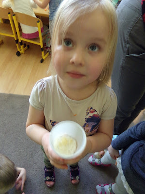 Po kilku dniach sprawdziliśmy co się stało z produktami spożywczymi, jak wyglądały. Jedne pokryte pleśnią, inne całkiem wyschnięte. Od marchewek zaczęły odrastać "korzonki", a chleb był w zielone kropeczki. Każdy produkt zbadaliśmy i opisaliśmy piktogramem, który opisywał zapach, kolor, konsystencję, twardość i inne zaobserwowane zmiany.